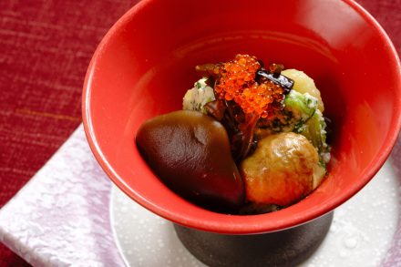 先附 春菊ときのこの白和え 栗 ひら茸 とびこ