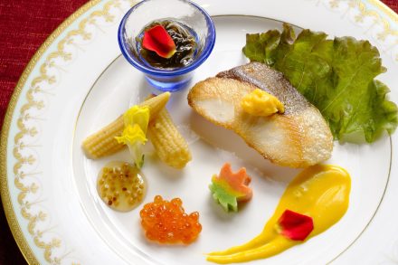 洋皿 超冷燻ブリのサバイヨンソース イクラ 紅葉麩 もずく もろこし土佐煮
